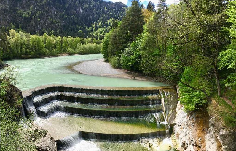 Szabályozott mederben lezúduló Lech, látványos vízesésszakasszal és helyi legendakörrel.