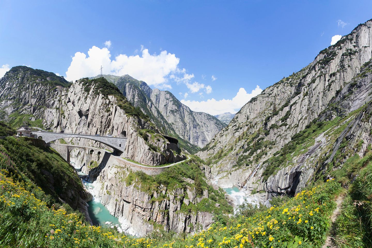 A Schöllenen-szoros a Gotthard út történelmi „szűk keresztmetszete”, itt épült az Ördög hídja a Reuss fölött.